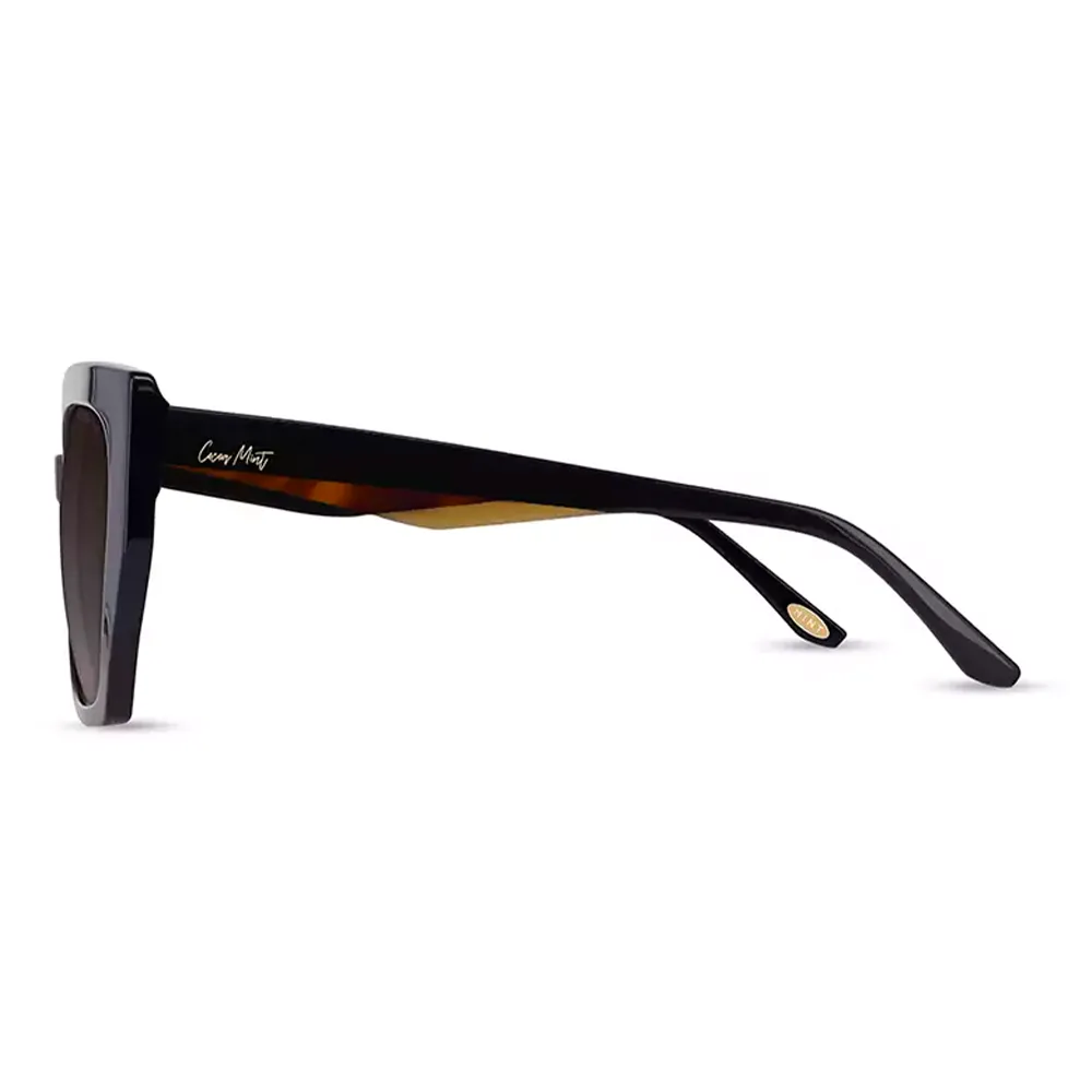 A modern women’s sun frame in bio‑based acetate with interlaced temple lamination and Brown Graduated category 3 Polarised lenses.