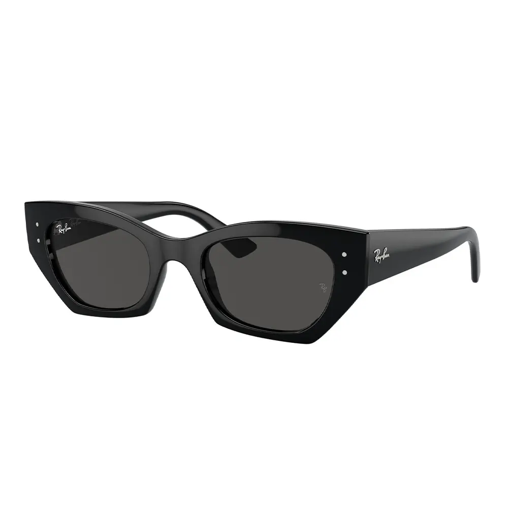 The Ray-Ban RB4430 Zena Bio-Based sunglasses feature a bold, angular cat-eye frame in black with dark grey lenses. Made from bio-based materials, these eco-friendly sunglasses combine stylish design with UV protection, offering a perfect mix of fashion and function.